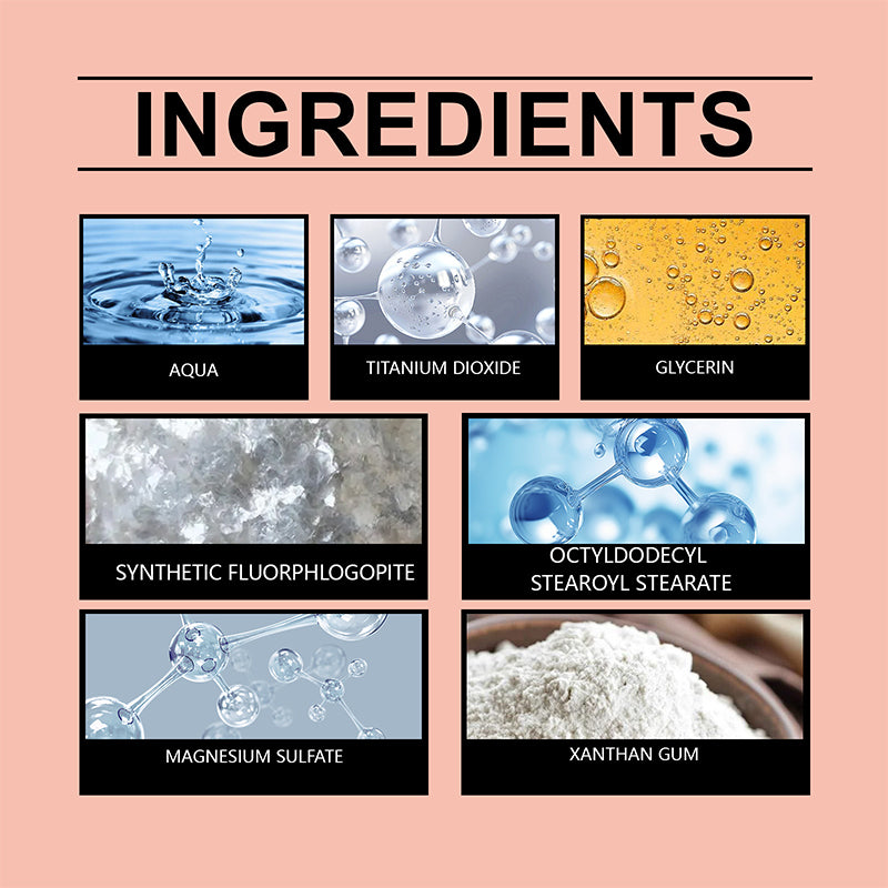 Ingredients: Water, Titanium Dioxide, Glycerin, Synthetic Fluorphlogopite, Magnesium Sulfate, Xanthan Gum, etc.